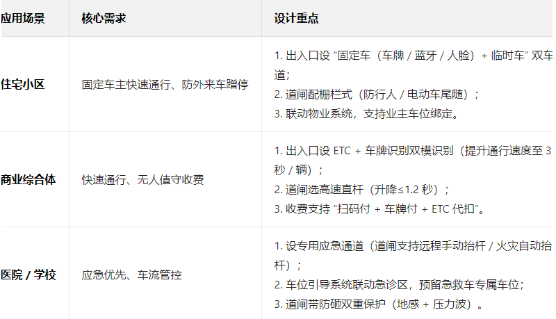高峰时段车流:商业综合体需按 “50 辆 / 小时 / 车道” 设计(配快速道闸,升降速度 0.8-1.5 秒);