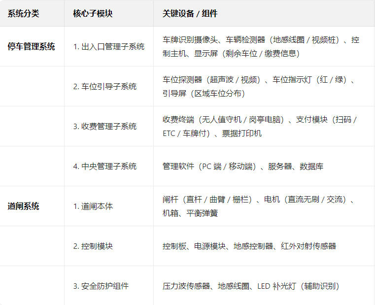 一、系统核心组成(停车系统 + 道闸系统)